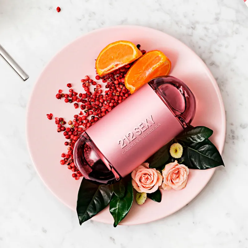 212 Sexy for Women EDP es una fragancia femenina oriental floral con salida especiada de pimienta rosa, bergamota y mandarina; corazón floral dulce con gardenia, rosa y notas de algodón de azúcar; y fondo cálido de vainilla, sándalo, caramelo y pachulí.