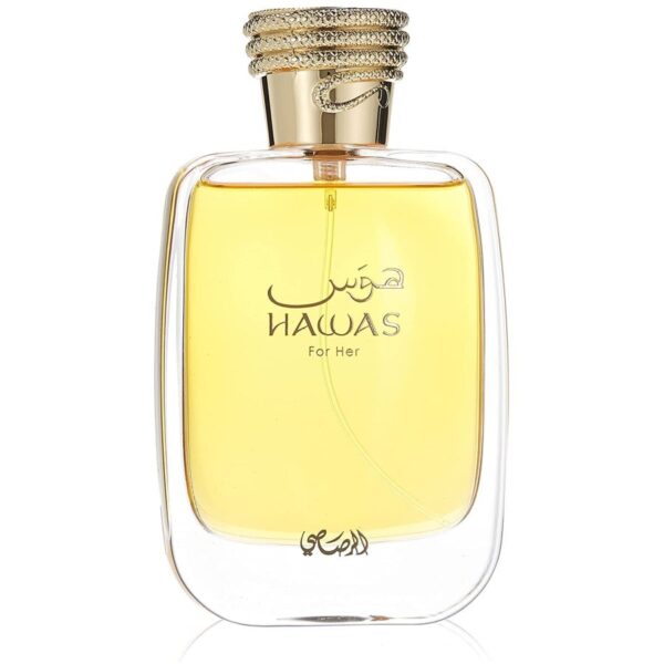 Hawas for Her de Rasasi es una fragancia de la familia olfativa Floral para Mujeres. Hawas for Her se lanzó en 2015. Las Notas de Salida son granada, manzana y toronja (pomelo); las Notas de Corazón son iris, jazmín sambac (sampaguita) y cítricos; las Notas de Fondo son praliné, pachulí y vetiver.